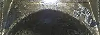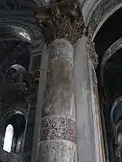 Даже в этих частях Мартораны, построенных гораздо позже норманнской эпохи, присутствуют арабские черты. Замеченная П. П. Муратовым[22] южная дверь вестибюля создана арабскими мастерами XII века; предположительно, при Георгии Антиохийском она закрывала вход в церковь, но после замены притвора и двора постройкой 1588 года была перенесена на нынешнее место. Две колонны вестибюля имеют резные арабские надписи. В верхней части одной колонны вырезано: «Поистине, Аллах — с теми, которые боятся (Его)» (сура 16, стих 128); в средней части — «Bo имя Аллаха милостивого, милосердного! На Него я положился, ведь Он — Господь великого трона!» (сура 3; сура 9, стих 130)[32]. На другой колонне вырезано пожелание Георгию: «Победы, приобретения, величия и удачи!» Происхождение этих колонн дискутируется: они могли быть взяты из какого-нибудь арабского дворца Палермо или специально созданы мусульманскими мастерами по заказу Георгия, знавшего арабский язык[33].