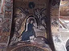 В северной части бывшего притвора находится мозаика, изображающая Георгия Антиохийского у ног Богородицы. Над его головой — греческая надпись: «Молитва раба Твоего адмирала Георгия». Правая рука Богородицы обращена к лежащему ниц Георгию, жестом приглашая его подняться, а левая рука держит хартию. Хартия гласит по-гречески: «Дитя, Святое Слово, да сохранишь Ты от бедствий Георгия, первого среди архонтов, который воздвиг этот Мой дом с самого основания; и даруй ему отпущение грехов, что только Ты, Боже, властен свершить». В правом верхнем углу мозаики Христос принимает молитву своей Матери и благословляет Георгия по её молитвам. Иконография мозаики безупречно византийская. Примечательна же мозаика тем, что на ней сохранилось подлинное лицо Георгия Антиохийского; ярко выраженные портретные — не символические — черты не оставляют в этом сомнений. Неудачная реставрация XVII века исказила фигуру лежащего Георгия, сделав её похожей на черепашью[3][29].