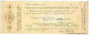 6 августа состоялось общее собрание архангельского торгово-промышленного союза. В своих выступлениях перед собравшимися глава правительства Н. В. Чайковский и управляющий отделом финансов Г. А. Мартюшин призвали представителей делового мира быть «Миниными, спасать Россию», поддержать идею выпуска Верховным управлением «Займа Доверия». Собрание приняло решение «Все свои свободные наличные знаки обратить в краткосрочный 5% процентный заем». Предприниматели за короткий срок собрали полтора миллиона рублей наличными. Около двух миллионов предоставили в распоряжение властей кооперативные организации. 8 августа Верховное управление приняло постановление «О краткосрочном займе». В нем отмечалось «Ввиду недостатка денежных знаков в Северной области признать необходимым выпустить краткосрочные 5% обязательства под наименованием «Займа Доверия» сроком на 6 месяцев на сумму 10 миллионов рублей». Обязательства были выпущены номиналом от 100 до 10 00 рублей за подписью председателя правительства и управляющего финансовым отделом[40].