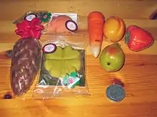 - фигурок фруктов или других фигурок, без глазури, но с красителем, в частности производства любекской кондитерской Niederegger;