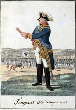 - сост. Яков фон Люде, грав. Кристиан Гейслер. Илл. 1. Генерал-фельдмаршал. // Изображение мундиров российско-императорскаго войска, состоящих из 88 лиц илюминованных 11 с., [1] л. фронт., 88 л. ил. — СПб.: Тип. Сухопут. кадет. корпуса, 1793.