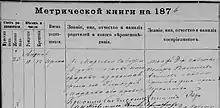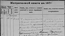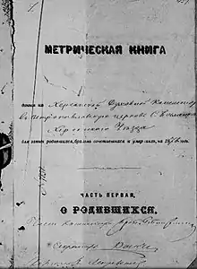 ![]() Титульная страница метрической книги | ![]() Запись в метрической книге | ![]() Запись в метрической книге |
