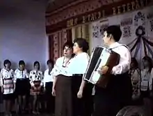 ![]() Поют Резниченко Л.В. и Терентьева Р.В. За аккордеоном Ковтун М.В. | ![]() Ученики школы исполняют пусню |