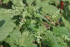 Растение высотой до 100 см. Стебель прямостоячий, простой или ветвистый, в сечении угловатый, с бороздками. Листья на длинных черешках, длиной от 5 до 20 см и 5—16 см шириной, яйцевидно-продолговатой формы у основания и узкие ланцетные у верхушки. Край листовой пластинки с редкими крупными зубцами. Цветки обоеполые собраны в рыхлые пирамидальные метельчатые соцветия. Цветение длится с июля по сентябрь.