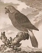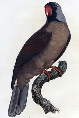 Путанице в окраске Маскаренских попугаев также поспособствовала французская гравюра из «Истории природы птиц» естествоиспытателя Франсуа-Николя Мартине в 1779 года, первая цветная иллюстрация данного вида. Она показывает, как птица коричневого цвета с пурпурной головой, а яркость этих цветов сильно варьировалась из копии в копию, являющаяся результатом работы различных художников, работавших под руководством Марине в его мастерской. Из-за этих копий окрас тела варьируется от каштанового до серовато-шоколадного, хвоста — от светло-серого до тёмно-серо-коричневого, а голова — от голубовато-серого до серо-голубого. На гравюре также отсутствует особенность, описанная Бриссоном, — два тёмных средних хвостовых пера без белой основания, которые были упущены поздними художников. Иллюстрация Марине и описание Буффона возможно базировались на парижском экспонате[3].