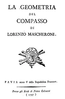 Маскерони был также поэтом и посвятил свою книгу Geometria del compasso (1797) Наполеону в стихах. Это была одна из самых известных работ математика, в которой он доказал, что все операции, которые могут быть выполнены с помощью циркуля и линейки, можно выполнить при помощи одного лишь циркуля. Этот результат позже был назван теоремой Мора — Маскерони, поскольку впервые доказательство было опубликовано датским учёным Георгом Мором в 1672 году.