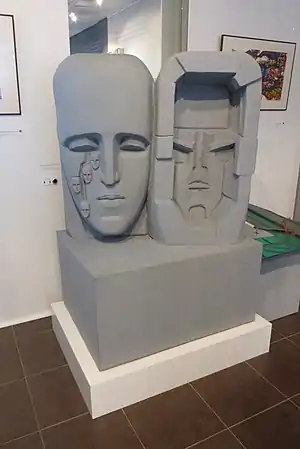 Памятник представляет собой трёхметровую бронзовую скульптуру весом 6 тонн[15]. Это две женские маски, соединённые одна с другою. Памятник расположен недалеко от того места, где проходит граница между Европой и Азией. Одна маска «смотрит» в Европу — на Первоуральск. Вторая маска «смотрит» в Азию — в Екатеринбург. Из левого глаза каждой маски выпадают в виде «слёз» маленькие маски.