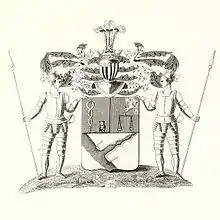 На щите дворянский коронованный шлем. Нашлемник: три страусовых пера. Намёт на щите голубой и красный, подложенный золотом. Щит держат два воина с пиками. (Гербовник VI, 73).