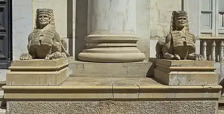 Здание расположено в глубине дворика, на некотором расстоянии от дороги. Оно обильно украшено символикой, преимущественно египетского происхождения. Фасад разделен на три части: центральная состоит из двух огромных частично встроенных колонн с гладким фустом, и капителей, украшенных пальмовыми листьями, на которых покоится большой треугольный фронтон. На фронтоне расположен глаз в окружении сияющих лучей, представляющий собой Высшую Сущность, Великого Архитектора Вселенной согласно масонской символике. Каждую колонну охраняют два сфинкса (четыре в общей сложности), лежащие на животах и покрытые немесами. Деревянная входная дверь украшена вырезанными геометрическими мотивами; перемычку над дверью венчают пальмовые листья и изображение солнца с крыльями орла, символа бога Хора. Здание стоит на стереобате.
