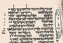 В четырёх словах МТ была добавлена надписанная «подвешенная» (висячая[69]) буква, чтобы исправить текст. Таков Суд. 18:30 מנשה, в котором подвешенная буква нун исправляет в имени Менаше (Манассия) первоначальное «Моше» (Моисей, מנשה), на что указывает огласовка. Исправление древнего чтения произошло, чтобы не приписывать возведение идола в Дане одному из потомков Моисея (Талмуд, Бава Батра 109b). Оба варианта отражены в греческой традиции: в Александрийском кодексе Септуагинты содержится чтение др.-греч. Μωυση — «Моисей», а в Ватиканском — др.-греч. Μανασση («Манассия»)[70].