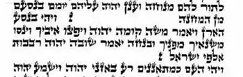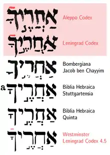 - «Конечная масора» — маарехет (др.-евр. מערכת), по-латыни — Masorah finalis. Это списки, помещаемые в начале или конце библейских книг. Прежде всего, это перечни различий между системами Бен-Ашера и Бен-Нафтали, открытых и закрытых разделов и т. д. Развитая Masorah finalis помещена в Библии Бомберга 1525 года, сведения её были извлечены из разных источников составителями данного издания. В частности, там подсчитано количество букв, слов и стихов в различных книгах Библии, например, для книги Бытия приведено число стихов 1534[79]. Яаков бен Хаим большей частью использовал справочник Охла ве-Охла — алфавитный перечень слов, которые встречаются в Танахе единожды или дважды. Отдельные научные издания этого текста по рукописям выходили в 1864 и 1975 годах[80].