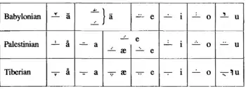 - Вавилонская, в которой знаки огласовок также помещались над согласными. Эта система имела простой и составной варианты.