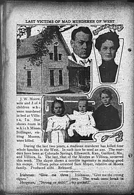 10 июня 1912 года в собственном доме была найдена зверски убитой семья одного из самых богатых жителей города — бизнесмена Джозии Мура. Джозия Мур, его жена Сара, трое сыновей и одна дочь (все дети возраста не более 11 лет), а также две подруги семьи — сестры Лина и Айна Стиллинджер 9 и 12 лет, оставшиеся на ночь в гостях у семьи Мур, были убиты топором ночью, когда спали.