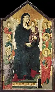 - 3. «Полиптих Монтеспеккио» (он же «Полиптих Креволе», т.к. его центральная панель «Мадонна с младенцем» хранилась в церкви Санта Чечилия а Креволе). Полиптих был давно расформирован, поэтому «Мадонна с младенцем» ныне хранится в Музее собора, Сиена, а четыре боковые панели с изображениями святых Августина, Павла, Петра и Антония в сиенской Пинакотеке. На оборотной стороне центральной панели сохранилась полустёртая надпись, сообщающая, что образ был посвящён церкви Санта Мария ди Монтеспеккио, и дата, позволяющая сделать вывод, что полиптих был готов к 16 апреля 1307 года.