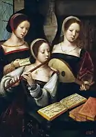 Картина «Музыкантши» — одна из самых характерных работ Мастера женских полуфигур. Работа имеет несколько вариантов, из которых лучший находится в собрании Харрах (Замок Рорау близ Вены, Австрия). Музицирующие девушки изысканны и элегантны: они одеты в модные для XVI века платья, изящно держат в своих руках музыкальные инструменты. Однако лица музыкантш похожи друг на друга, художник и не пытался изобразить глубокие образы. Мастер, вероятно, хорошо владел нотной грамотой. По мнению известного советского музыканта Александра Майкапара в эрмитажном варианте работы музыкантши исполняют песню известного в своё время композитора Клодена де Сермизи (1490—1562) на слова поэмы Клемана Маро[3]. В нотах по-французски записан текст: