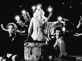 ![]() Сцена из спектакля. Бал при свечах. Бегемот — Юрий Смирнов, Маргарита — Нина Шацкая, Коровьев — Иван Дыховичный | |