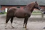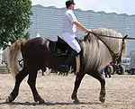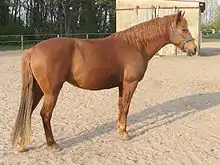 Гнедая — лошадь, корпус которой коричневого окраса различных оттенков, от огненно-рыжего до почти чёрного, похожего на караковую, а грива, хвост и нижние части ног, до скакательных и запястных суставов включительно — чёрные. Изредка встречается так называемая «дикая» гнедая масть, при которой чёрный волос на ногах лошади частично перемешан с коричневым, в результате чего дистальные отделы конечностей не угольно-чёрные, и чёрная шерсть не доходит до запястных и скакательных суставов[3]: