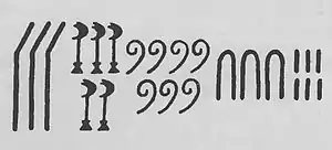 Древнеегипетская нумерация, то есть запись чисел, была похожа на римскую: поначалу были отдельные значки для 1, 10, 100, … 10 000 000, сочетавшиеся аддитивно (складываясь). Египтяне обычно писали справа налево, и младшие разряды числа записывались первыми, так что в конечном счёте порядок цифр соответствовал нашему. В иератическом письме уже есть отдельные обозначения для цифр 1-9 и сокращённые значки для разных десятков, сотен и тысяч[5].