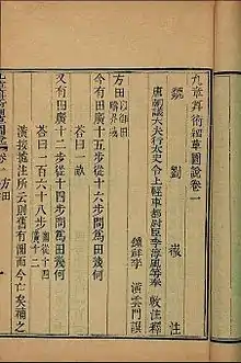 - 方田 Фан тянь, «Измерение полей» — Вычисление площадей: треугольники, многоугольники, круг, сегменты и секторы круга, круговое кольцо (судя по пояснениям, автор принимал, что )[2]. Операции с дробями. Алгоритм поиска наибольшего общего делителя двух чисел, аналогичный евклидовскому.