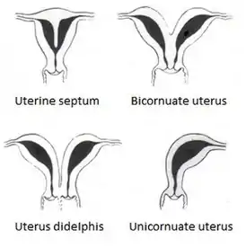 - Удвоение тела матки — дефект развития матки, который характеризуется удвоением матки или её тела, что происходит вследствие неполного слияния двух мюллеровых протоков на этапе раннего эмбрионального развития. Как результат у женщины с двойной маткой могут быть одна или две шейки матки и одно влагалище. При полном неслиянии этих протоков развиваются и две матки с двумя шейками и двумя влагалищами.