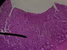 - Эндометрий (Слизистая оболочка) — образует внутренний слой стенок матки. Состоит из слоя цилиндрического эпителия, выстилающего поверхность и железы, и собственной пластинки соединительной ткани, связанной с миометрием. Она пронизана простыми трубчатыми железами, которые открываются на поверхность эпителия, самые глубокие их части достигают миометрия. Среди секреторных клеток рассеяны группки реснитчатых цилиндрических клеток. Эндометрий состоит из двух слоёв — поверхностного, толстого слоя, называемого функциональным, и глубже расположенного — базального слоя.