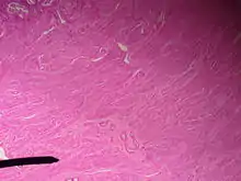- Миометрий (Мышечная оболочка) — наиболее толстый слой маточной стенки, состоит из трёх слоёв гладких мышечных волокон с примесью волокнистой соединительной ткани и эластических волокон;