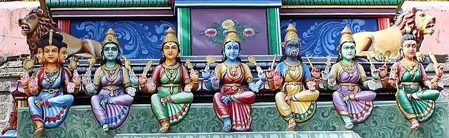 В индуизме обычно упоминаются и изображаются Брахмани, Махешвари, Каумари, Вайшнави, Варахи, Индрани (Аиндри) и Камунди (Чамунда), хотя существуют и другие имена богинь. Иногда упоминается не семь, а восемь богинь («аштаматрика»), к ним относятся все перечисленные, а также Махалакшми[4]. Поклонение саптаматрике распространено в Южной Индии, в то время как аштаматрика почитается в Непале[5]. Они часто изображаются вместе в указанном порядке вместе с Вирабхадрой и Ганешей, исполняющими роль их охранников[6]. Во время поклонения порядок перечисления матрик может меняться в зависимости от цели ритуала. К примеру, чтобы победить врага, Брахмани помещают в центр, а для увеличения потомства — Камунди[7].
