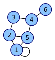 - Ниже приведён пример неориентированного графа и соответствующей ему матрицы смежности . Этот граф содержит петлю вокруг вершины 1, при этом в зависимости от конкретных приложений элемент может считаться равным либо одному (как показано ниже), либо двум.