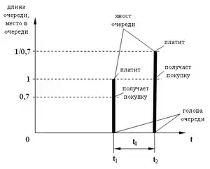 Например, товар продаётся за 70 % от суммы издержек на его производство и прибыли организатора схемы (). После того, как все участники сдадут деньги, товар получат только 70 % от участников. Далее в конец очереди присоединяется новый участник, а участник, занимающий место, отстоящее от начала очереди на 70 % всей длины очереди, получает товар (см. рисунок). Аналогично обстоят дела в любой момент развития схемы. Присоединившийся в конец очереди и сам когда-нибудь получит товар, допустим, через период времени (на рисунке человек, стоящий на позиции , платит в момент времени и получает покупку в момент времени ). Этот период не превышает разумного предела, чтобы покупатель не беспокоился. Допустим, фиксированный. Тогда за время длина очереди должна вырасти в раз. Таким свойством обладает показательная функция . Таким образом, количество участников схемы должно расти экспоненциально.