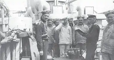 Выдача водки матросам на крейсере «Россия» Русского Императорского Флота.