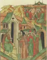 ![]() Всеволод IV Чермный просит митрополита Матфея выступить посредником между черниговскими князьями и Всеволодом III Большое Гнездо | ||