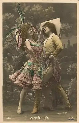 Удивительно то, что в Бразилии машише формировался на протяжении 10 или более лет, а «новый салонный танец матчиш» возник в Париже за несколько месяцев, что вполне соответствовало духу времени, когда новые танцы мгновенно появлялись и тут же забывались. В отличие от Бразилии во Франции процесс шёл в обратном порядке, не из танцевального зала на сцену театра, а наоборот: «Описанный танец — явно сценическая хореография, что не типично для описаний социальных танцев этого периода»[26]. Сценическая хореография модных ревю превратилась в салонный танец. Публика вводилась в заблуждение красочными открытками под названием La Mattchiche, изображавших заимствованные из театральных постановок фигуры «нового салонного танца».