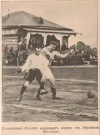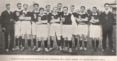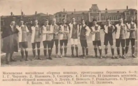| Москва: Н.Ильин («Унион») – В.Мишин (КСО), М.Ромм (СКС) – Н.Кынин (КСО), В.Иванов (СКС), С.Филатов-II (ЗКС) – М.Смирнов (СКС), В.Серпинский (СКС), А.Скорлупкин (СКС), А.Филиппов (КФС), М.Филиппов (КФС) Москва: В.Виноградов (СКС) – П.Даун (БКС), Болл (БКС) – Э.Чарнок (КСО), Трипп (ЗКС), А.Эллисон (ЗКС) – Сандерс («Мамонтовка»), Г.Уайтхэд (БКС), Г.Ньюман (БКС), Д.Ланн (БКС), Т.Джонс (БКС) |