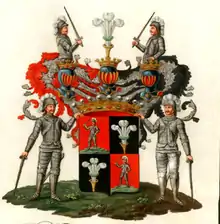 Описание герба: Графский герб В первой и четвёртой части в красном поле изображён стоящий Воин одетый в Панцирь, правою рукою держащий обнажённый Меч. Во второй и третьей части в чёрном поле видны три пера Страусовые белые, обвитые посередине Лавром, вставленные в продолговатую золотую на концах острую подставку. Шит покрыт Графской Короной, с тремя на оной шлемами увенчанными же, из них на среднем в прямом положении находящемся, видны три пера Страусовые вставленные в таковую же, как в щите означена, подставку, а на крайних шлемах один к другому обращённых, подымаются два Воина в Панцире с обнажёнными Мечами. Щитодержатели с обеих сторон два Воина в Панцире, смотрящие друг на друга, и одной рукой держат щит, а другой вниз опущенной обнажённый Меч. |