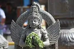 - Гаруду зовут и другими именами: Таркшья (IAST: Tārkṣya), птица; Супарна (IAST: Suparṇa), с красивыми крыльями; Хагешвара (IAST: Khageśvara), повелитель птиц; Гаганешвара (IAST: Gaganeśvara), владыка неба; Ситанана (IAST: Sitānana), белоликий; Рактапакша (IAST: Raktapakṣa), с красными крыльями; Швета-рохита (IAST: Śvetarohita), бело-красный; Суварнакая (IAST: Suvarnakaya), златотелый; Нагантака (IAST: Nāgāntaka), истребитель змей; Тарасвин (IAST: Tarasvin), быстрый. Благодаря известной истории о похищении сосуда с амритой Гаруда известен как Амрита-харана (IAST: Amṛtāharaṇa), похититель нектара. Его тесную связь с Вишну отражает ещё одно имя, Вихангама (IAST: Vihaṅgamā), (солнце) летящее по небу — один из образов Вишну.