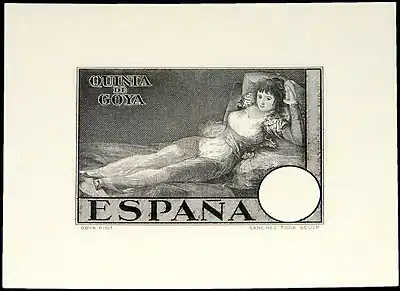 Марки с обнажённой Махой были заказаны в лондонской типографии Waterlow and Sons частным образом, но государственная почта Испании (Correos) в обмен на часть тиражей признала этот выпуск легитимным. Заявленной целью его распространения было окупить затраты на строительство Quinta de Goya (букв. «загородный дом Гойи»)[6] — целиком посвящённого творчеству знаменитого испанца выставочного павильона, где были размещены некоторые его картины и офорты[7].