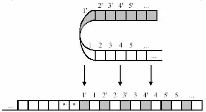 Начальное состояние новой машины Тьюринга устанавливается в одной или другой зоне в зависимости от того, в какой части исходной ленты располагалась головка считывания-записи в исходной конфигурации. Очевидно, что слева от ограничивающих маркеров «*» лента в эквивалентной машине Тьюринга не используется.