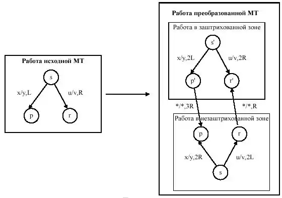 Наконец, изменим машину Тьюринга, удвоив число её состояний, и изменим сдвиг головки считывания-записи так, чтобы в одной группе состояний работа машины была бы эквивалентна её работе в заштрихованной зоне, а в другой группе состояний машина работала бы так, как исходная машина работает в незаштрихованной зоне. Если при работе МТ встретится символ ‘*’, значит головка считывания-записи достигла границы зоны: