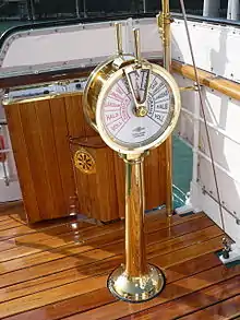 Маши́нный телегра́ф — устройство для передачи из ходовой рубки судна в машинное отделение команд изменения режима работы двигателей. Обычно состоит из механически связанных между собой рукоятки, установленной на ходовом мостике судна, и стрелки, установленной в машинном отделении. Рукоятка (и соответственно стрелка) имеет несколько фиксированных положений, указывающих необходимый режим работы двигателя судна («Стоп», «Малый», «Средний», «Полный», «Самый полный»). Для привлечения внимания вахтенного начальника машинного отделения приемная часть машинного телеграфа имеет гонг, срабатывающий при перемещении стрелки. Чаще всего связь двухсторонняя. Получив команду по изменению режима работы двигателя, вахтенный начальник машинного отделения сообщает об этом (переводом рукоятки) обратно на ходовой мостик. Следует иметь в виду, что машинный телеграф непосредственно не управляет двигателем судна.