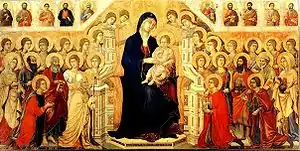 В отличие от первых икон середины XIII века, на которых Мадонну изображали сидящей на троне с Младенцем на руках, а Её царственный статус обозначался только знаками в виде царских орлов на мафории или короны на голове, изображения Мадонны стали в дальнейшем окружать святыми и ангелами. Такой Мадонна предстает в образе «Маэста» работы Дуччо ди Буонинсенья, где Её свита, если считать средний и верхний регистры алтарной картины, достигает сорока персон. Тип изображения «Маэста» был особенно популярен в Италии в XIII и XIV веках, поэтому большинство ведущих художников Умбрии и Тосканы писали образы «Маэста» с большим количеством предстоящих фигур ктиторов и донаторов по желанию могущественных заказчиков.
