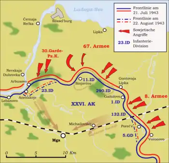 Отражая очередное советское наступление в июле — августе 1943 года, войскам 18-й немецкой армии пришлось использовать все силы и средства. К концу августа, израсходовав все резервы и понеся большие потери, немецкие войска, возможно, были бы вынуждены оставить Мгинский выступ в случае продолжения советского наступления. К. А. Мерецков в своих мемуарах отметил[4]: