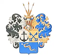 Щит полурассечён и пересечён. В первой, серебряной части чёрный якорь с кольцом и анкерштоком. Во второй, золотой части два накрест положенных лазоревых ключа. В третьей, лазоревой части, серебряная трость в перевязь, обвитая золотой змеёй.