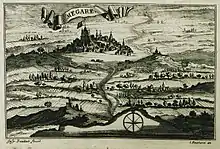 Древнегреческий город находился в юго-западной части Мегариды в 8 стадиях от берега залива Сароникос[7] и имел два акрополя — Карию (др.-греч. Καρία) и Алкафоев (др.-греч. Άλκάθους)[8], от стен которых видны ещё небольшие остатки; акрополь Кария был основан, по преданию, царем Каром, сыном Форонея, царя аргосских пеласгов. Потом городом овладели лелеги, а внук царя Лелега, Пилас, передал царство афинскому царю Пандиону, при котором страна перешла в руки ионян и составляла одно царство с Аттикой.