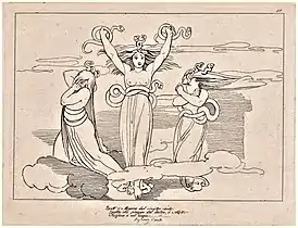 Олицетворение зависти и гнева. Изображали её в виде ужасной женщины со змеями вместо волос, с оскаленными зубами и бичом[6] в руках.