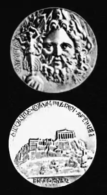 На лицевой стороне наградной медали выгравирована Шаплэном голова Зевса Олимпийского, отца богов. Он сжимает в правой ладоне земной шар, со стоящей на нём богиней победы Никой, которая придерживает руками над головой огромную оливковую ветвь. Слева расположена, вертикально с низу вверх, надпись греческими буквами: Олимпия (англ. OLYMPIA; греч. Ολυμπία). Справа фамилия художника Жюль Шаплен (англ. J. C. Chaplain; греч. J. C. Shaplen).