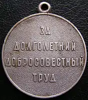 На оборотной стороне медали на матовом светлом фоне в четыре строки расположена рельефная надпись «ЗА ДОЛГОЛЕТНИЙ ДОБРОСОВЕСТНЫЙ ТРУД».
