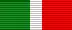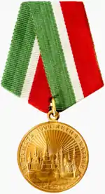 Медаль при помощи ушка и кольца соединяется с пятиугольной колодкой, обтянутой шёлковой муаровой лентой. Ширина ленты — 24 мм. Лента трёхцветная: слева — полоса зелёного цвета, справа — полоса красного цвета, каждая — шириной 10 мм. Между ними — полоса белого цвета шириной 4 мм.[2]