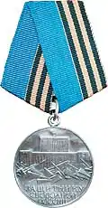Медаль при помощи ушка и кольца соединяется с пятиугольной колодочкой, обтянутой муаровой сдвоенной лентой шириной 24 мм, наполовину голубой, наполовину «георгиевской».