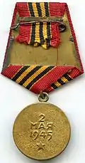 Медаль при помощи ушка и кольца соединена с пятиугольной колодкой, обтянутой красной шелковой муаровой лентой шириной 24 миллиметра. Посредине ленты пять полосок: три черные и две оранжевые (так называемая «гвардейская лента»). Крайние черные полоски окаймлены узенькими оранжевыми полосками[10][12].