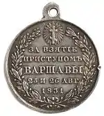 Медаль «За взятие приступом Варшавы» предназначалась для награждения участников штурма Варшавы, который происходил с 25 августа (6 сентября) — 26 августа (7 сентября) 1831 года. Штурм Варшавы был частью подавления длительного польского восстания. Медаль учреждена по указу[2] Николая I от 31 декабря 1831 (12 января 1832) года[1][3].